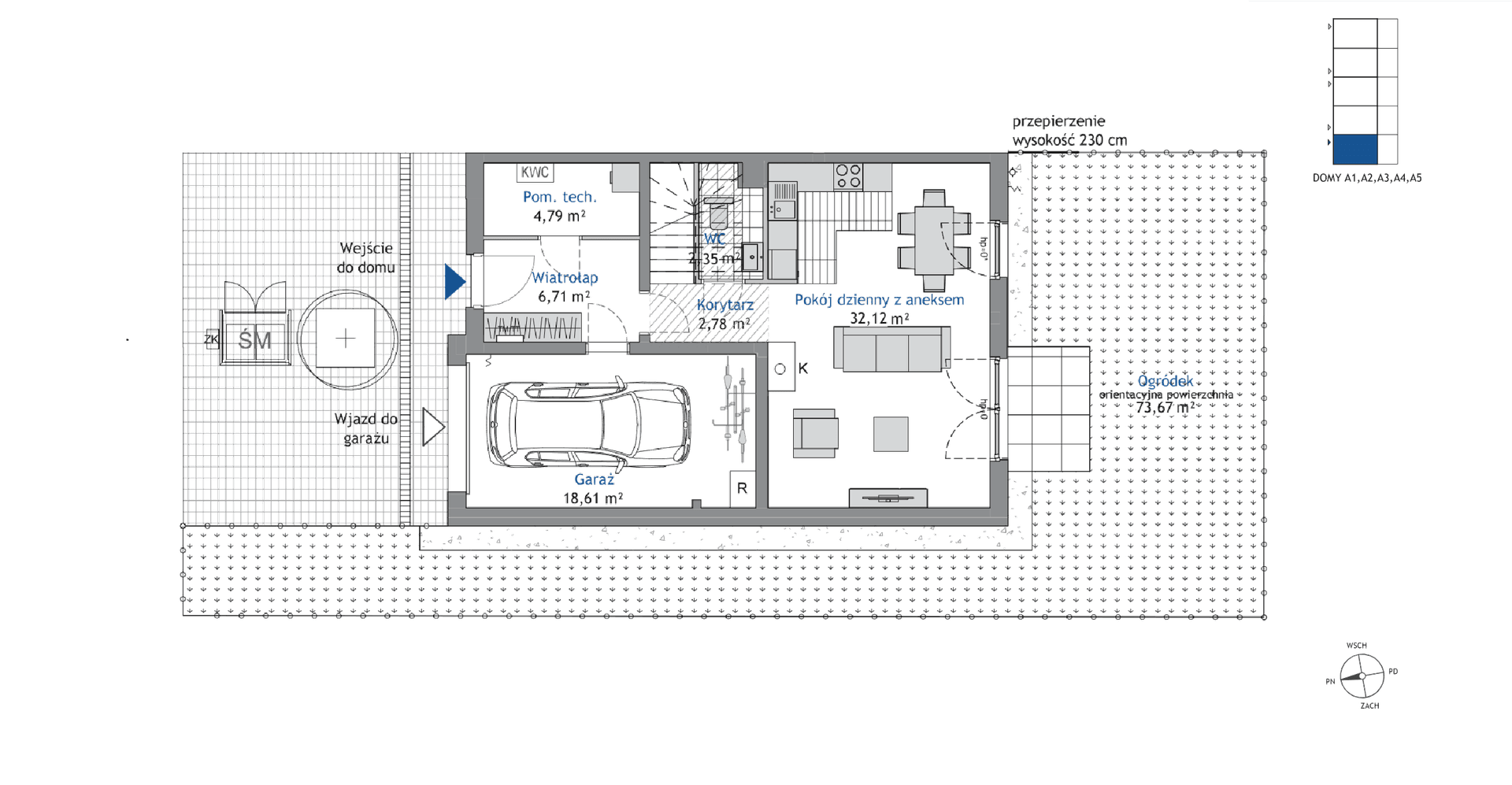 Garaż jednostanowiskowy o powierzchni 18,61 m² wpisuje się w funkcjonalność całego budynku, który oferuje łącznie 137, 10 m² powierzchni. Dom A1 zlokalizowany jest na działce o wielkości 213,18 m². Bryła budynku wyróżnia się materiałami elewacyjnymi – uszlachetniony tynk oraz płyty włókno-cementowe o zróżnicowanej fakturze tworzą spójną i nowoczesną całość.