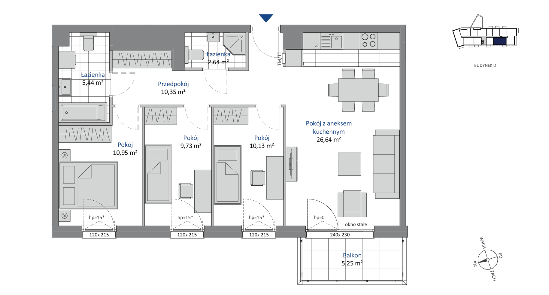 Trzypokojowe mieszkanie o powierzchni 61,82 m² położone jest na pierwszym piętrze i oferuje zachodnią ekspozycję, sprzyjającą popołudniowemu nasłonecznieniu. Pokój dzienny z aneksem kuchennym (26,43 m²) to centrum codziennej aktywności, z wyjściem na balkon (5,25 m²), który może pełnić rolę kameralnego miejsca odpoczynku.