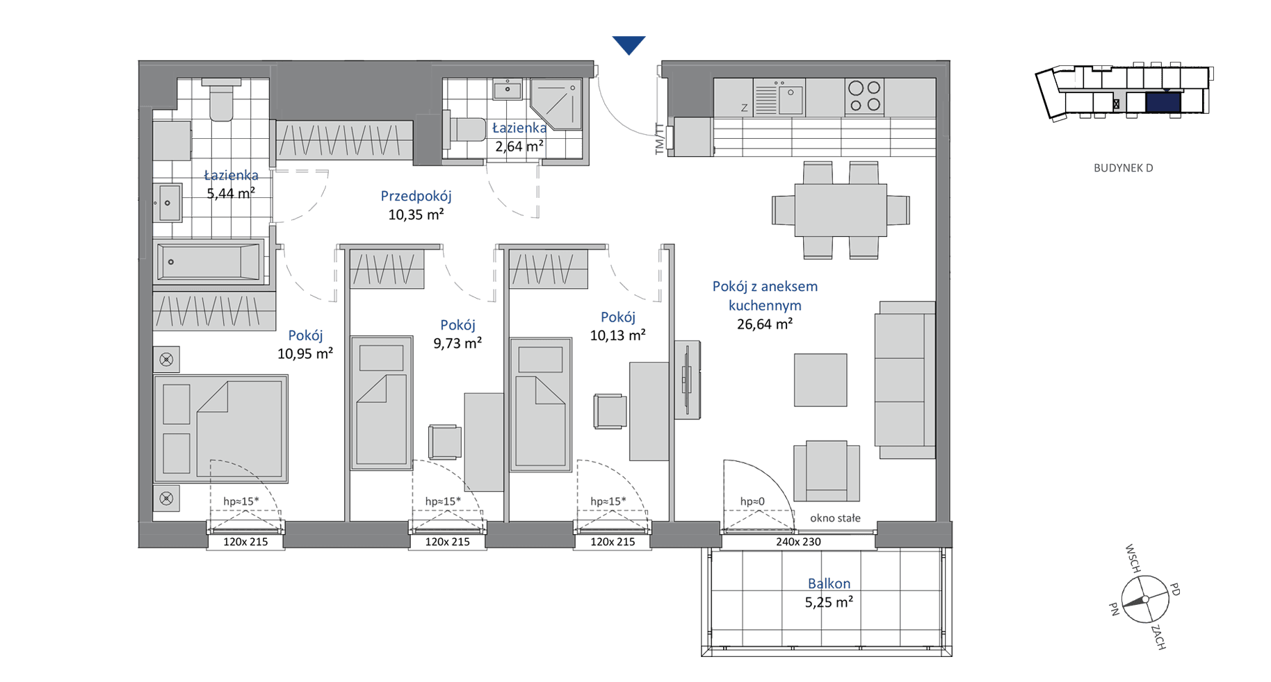 W mieszkaniu zaprojektowano trzy sypialnie (10,95 m², 10,13 m² i 9,73 m²), które mogą pełnić funkcję pokoi dziecięcych, gabinetów lub sypialni głównych. Dwie łazienki (5,44 m² i 2,64 m²) zwiększają komfort codziennego użytkowania, zwłaszcza przy większej liczbie domowników. Przedpokój (10,35 m²) z miejscem na zabudowaną szafę ułatwia przechowywanie i porządek już od wejścia.
