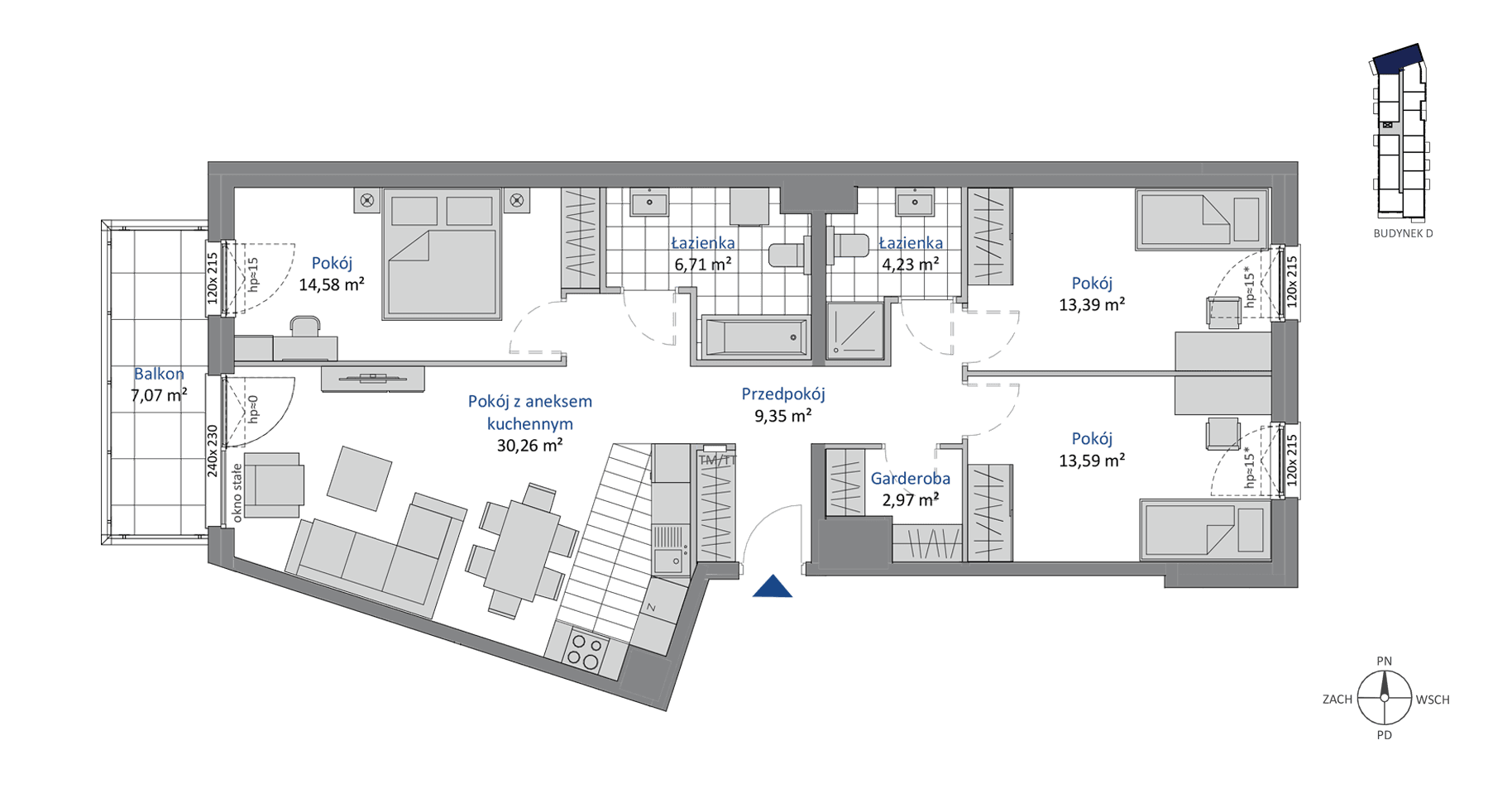 Mieszkanie wyposażone jest w trzy sypialnie (14,58 m², 13,59 m² i 13,39 m²), które można zaaranżować zgodnie z indywidualnymi potrzebami domowników. Dwie łazienki (6,71 m² i 4,23 m²) zwiększają komfort użytkowania na co dzień. Dopełnieniem całości jest funkcjonalna garderoba (2,97 m²) oraz przedpokój (9,35 m²) z miejscem na zabudowaną szafę.