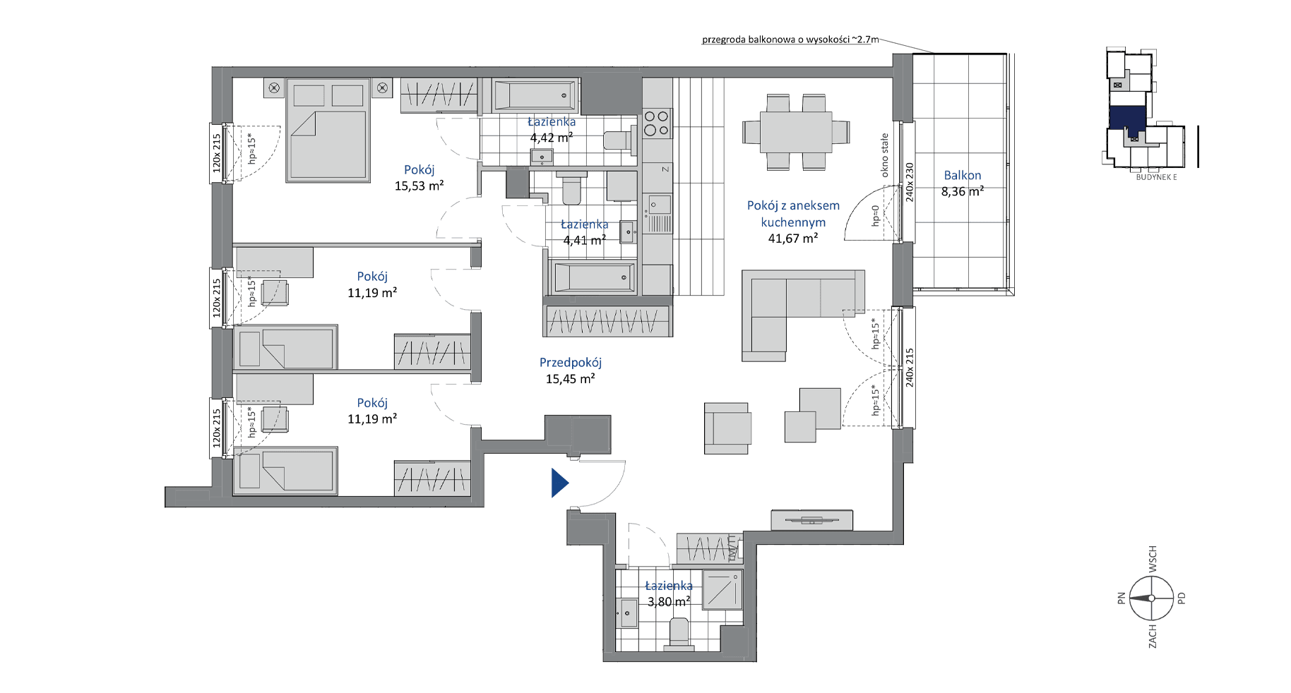 Do dyspozycji mieszkańców są trzy sypialnie (11,19 m², 11,19 m² i 15,53 m²), które można zaaranżować zgodnie z indywidualnymi potrzebami – jako pokoje dziecięce, gabinety czy sypialnię główną z prywatną łazienką. Aż trzy łazienki (3,80 m², 4,41 m² i 4,42 m²) gwarantują wygodę w codziennym użytkowaniu. Przedpokój (15,45 m²) z miejscem na zabudowaną szafę porządkuje wejście do mieszkania i oferuje dodatkową przestrzeń do przechowywania.