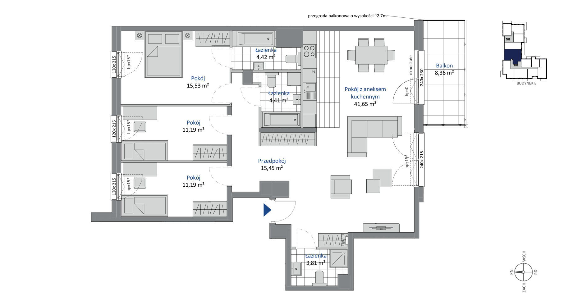 Trzy sypialnie (11,19 m², 11,19 m² oraz 15,53 m²) oferują szerokie możliwości aranżacyjne, pozwalając wyodrębnić prywatne strefy. Trzy łazienki (3,81 m², 4,41 m² i 4,42 m²) podnoszą komfort codziennego życia. Przedpokój (15,45 m²) z miejscem na szafę w zabudowie zapewnia wygodne przechowywanie oraz porządek już od wejścia.
