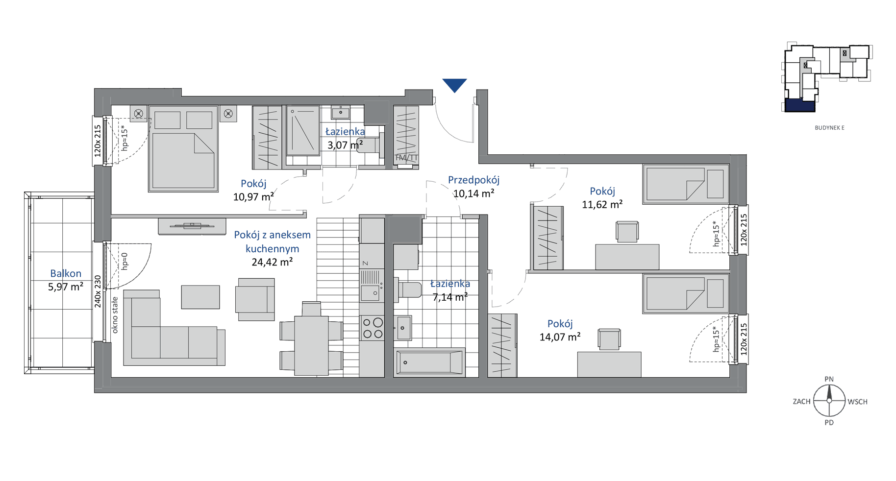Trzy sypialnie (10,97 m², 11,62 m² oraz 14,07 m²) dają szerokie możliwości aranżacyjne, pozwalając stworzyć prywatne strefy do pracy, relaksu czy snu. Dwie łazienki (3,07 m² i 7,14 m²) podnoszą komfort codziennego życia. Przedpokój (10,14 m²) z miejscem na szafę w zabudowie zapewnia funkcjonalne przechowywanie oraz porządek od samego wejścia.