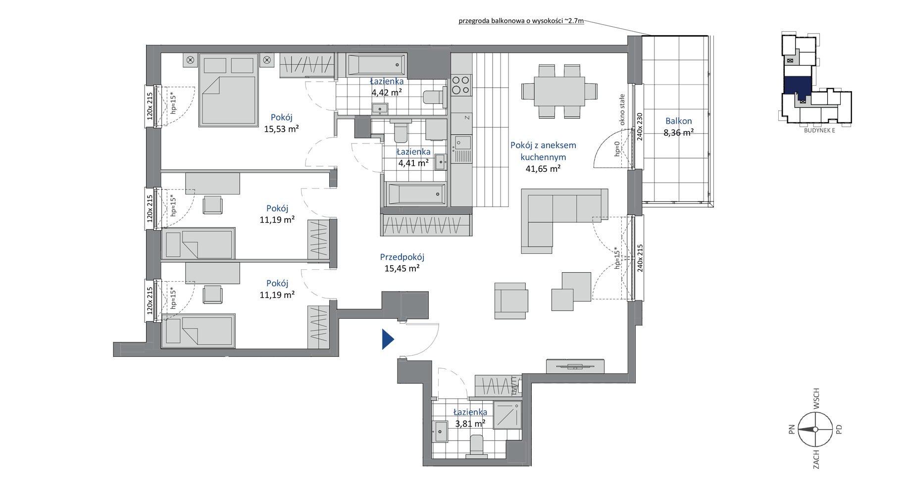 Trzy sypialnie (11,19 m², 11,19 m² oraz 15,53 m²) dają szerokie możliwości aranżacyjne, pozwalając na wyodrębnienie stref prywatnych. Trzy łazienki (3,81 m², 4,41 m² i 4,42 m²) podnoszą komfort codziennego życia. Przedpokój (15,45 m²) z miejscem na szafę w zabudowie sprzyja praktycznej organizacji przestrzeni i utrzymaniu porządku od progu mieszkania.